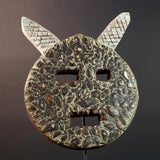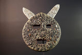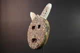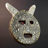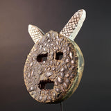 Carved from wood and covered in embedded textures, this mask has angular eye and mouth cuts and a wide symmetrical form. The double “horns” give it a fierce yet sacred visual balance.