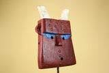 This handmade African mask is carved in a tall rectangular plank form and crowned with two vertical horns. The face is finished in rich red pigment and decorated with raised dot patterns, a visual language commonly associated with Bwa ceremonial art. Narrow eye openings accented in blue and a sharply carved nose complete the powerful expression.