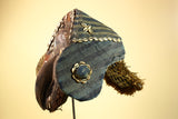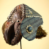 This African Dan mask is a striking vintage mask carved in wood and wrapped in aged textile, crowned with cowrie rows and a bold bird-beak form. The mask measures 40.5 × 32 × 41.5 cm and shows traditional wear from use. Rich textures, metal accents, and tribal color tones give the mask strong presence. A classic Côte d’Ivoire design, this mask suits collectors, cultural interiors, and gallery display. Stand not included.
