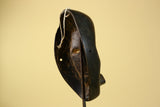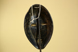 This African Dan mask is a carved wood mask from Liberia, shaped in the classic oval Dan style with defined features and warm patina. The mask measures 23.6 × 14.6 × 8 cm (9.2 × 5.7 × 3.1 in). This vintage mask shows age and use with natural wear, enhancing its character. The mask represents Dan tradition and is ideal as tribal art, décor, or collection display. A beautiful West African mask for wall or shelf. Stand not included.