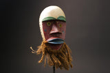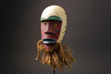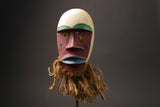 Exceptionally ancient mask by Dan Kran depicting a monkey (chimpanzee or vervet monkey). The 'Kagle Masks' of the village of Dunkland dance fiercely and aggressively, with full body costumes and hooked sticks. The current "Kagle mask" is made of strong but lightweight wood, stained black, and features a short, protruding forehead, deep-set triangular eyes, protruding triangular cheeks, and a large, open mouth. There is a (typical) iron pin on top of the head. The current "Kagle mask" is of a particularly ancient type, as indicated by the rectangular (rather than circular) shape and red tongue-coloured terracotta of the mask garment fastening eyelets along the edge of the mask. Black clay is also visible under the eyes and on top of the head. A very nice piece with proper old usage patina(