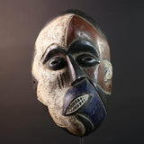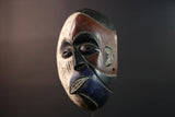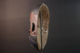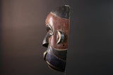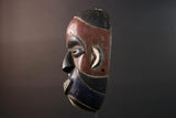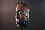 African wall decor Dan tribal mask with red white and blue split face carved features and symbolic teeth for expressive rustic display G5501