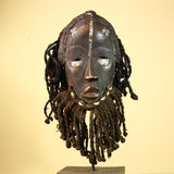Every contour of the mask reflects hand-carved craftsmanship, while the rope-braid beard adds movement and depth. The metal forehead inlay and white pigment traces emphasize the spiritual expression of the mask. This piece carries the raw authenticity and ceremonial character associated with older Dan traditions, Measurement-49/20.5/8