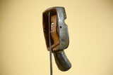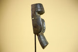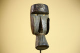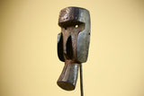 This African Teke mask from Congo is hand-carved from wood and features geometric planes, narrow eye slits, and a metal inlay on the forehead. Measuring 26.5 cm × 11 cm × 6 cm (10.4 × 4.3 × 2.3 in), it was traditionally used in rituals for protection and ancestral communication. The mask’s angular design and aged patina give it a strong sculptural presence. A striking example of tribal art wall decor and African craftsmanship. Stand not included.