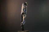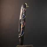 The elongated vertical face, narrow slit eyes, and low-set lips reflect classic Fang design. This contemporary version features painted triangle patterns in blue, red, and ochre on a deep black wood base — referencing modern reinterpretation of kaolin-covered originals. The minimalist form retains spiritual intensity.