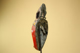 This African Baule mask is a hand-carved wood piece from Côte d’Ivoire featuring a bold red finish and a sculpted bird crest. The mask has elongated facial lines, narrow eyes, and painted geometric accents with an aged patina. Measuring 30.5 cm x 11.7 cm x 8 cm (12" x 4.6" x 3.1"), the mask shows wear consistent with age. A striking example of West African craftsmanship, ideal for wall display, interior décor, or collection. Stand not included.