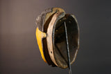 This vivid African Baule wall mask, with its yellow face and striking blue eyes, offers a bold statement of tribal artistry and symbolic heritage.