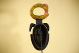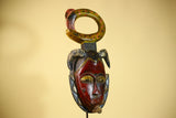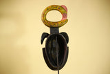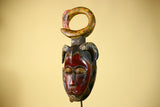 This Guro tribal mask is a striking hand-carved artwork from Côte d’Ivoire, showcasing the bold sculptural style and symbolic forms seen in traditional Guro art. The Guro tribal mask features a dramatic red and black face, framed by carved ram horns that symbolize strength and protection. Above the head rests a large circular serpent crest, adding height and movement to the design. Stand Not Included