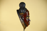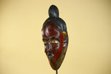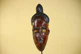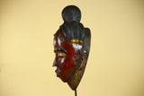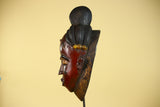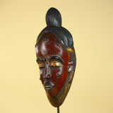 The wooden African mask displays rich red, brown, and black tones with a smooth aged surface. African masks like this are highly valued as African mask wall art and as collectible tribal art pieces.