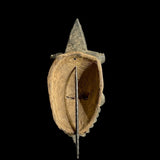This African tribal mask features pierced ears, similar to the ear flaps of the Eastern Boa, and is adorned with a flanked mask. The "Bavobongo" was once adorned with this mask, and its mouth is lined with sparse teeth.