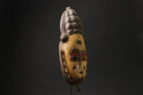 Mask With Raised Scar Patterns And A Subtle Grin, This Painted Carved Wooden Mask Showcases Stylized Ram Horns. Its Convincingly Worn Patina On The Back Implies Frequent Use In Mask Field.