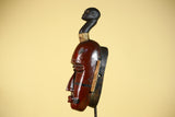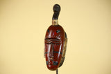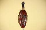 This handcrafted African mask features a long sculpted face with refined contours and a raised headdress. Carved from solid wood, the surface shows natural patina and wear that reflect age and traditional craftsmanship.