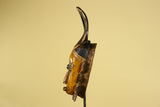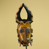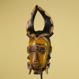 This handcrafted African wooden mask features a distinctive open-loop crest and refined facial carving inspired by Baule-style traditions. The warm wood tones, geometric details, and aged surface create a strong yet elegant presence.