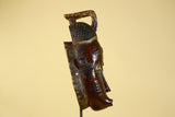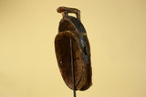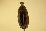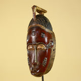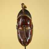 This Baule African mask is a hand carved wooden example of traditional West African tribal art. The elongated face, serene expression, refined scarification details, and carved crest element reflect classic Baule aesthetics associated with ceremonial and cultural use in Côte d’Ivoire.
