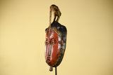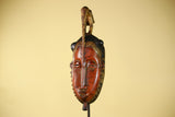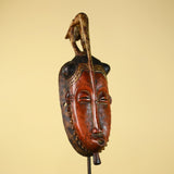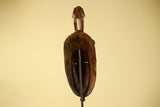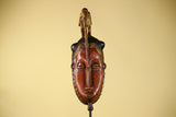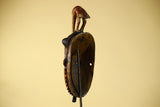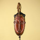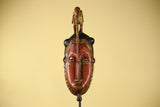 This vintage African Baule-style mask is hand carved from solid wood and features an elegant elongated face crowned with a symbolic bird figure. The calm facial expression, narrow proportions, and raised crest are characteristic of traditional West African ceremonial art.