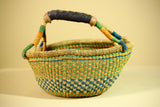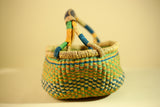 A traditional African Bolga basket handwoven from durable natural grass fibers using time-honored weaving techniques from Ghana. The basket features vibrant geometric color patterns created through dyed fibers, forming a visually dynamic yet organic design.