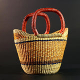 This African Bolga Basket is a vibrant and functional handmade storage solution, perfect for lovers of traditional craftsmanship. Woven from durable straw and featuring reddish-brown leather-wrapped handles, this authentic market tote comes from Ghana’s renowned Bolgatanga region. Bold orange and navy-blue bands curve around the basket, giving it a striking visual appeal.