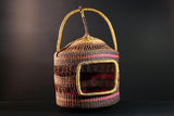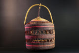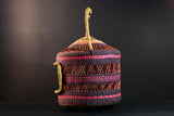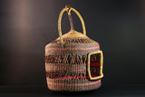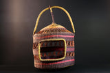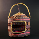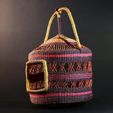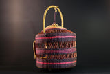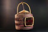 This handcrafted African Bolga basket serves as a unique and functional cat bed or decorative storage solution. Woven by artisans in Ghana, it features intricate patterns in earthy pink, yellow, and black tones. The natural straw structure offers durability while remaining lightweight and breathable—ideal for pets or as a striking storage accent.
