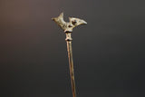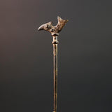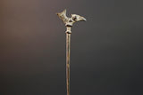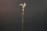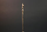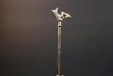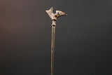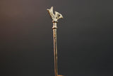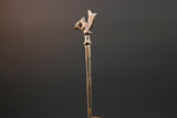 This bronze sculpture features a slender vertical rod topped with a stylized bird, possibly representing guidance, foresight, or ancestral power. The form is minimal yet intentional, cast using the lost-wax method. Its warm patina and textured surface show subtle wear from traditional handling or ceremonial placement.