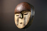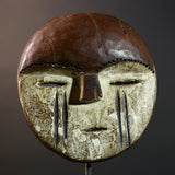 Mask – This African Lega Bwami mask from Congo is hand-carved from wood and reflects the artistry of Bwami society traditions. The face displays a domed forehead, slit eyes, and vertical scarification lines, elements used in initiation and symbolic rituals. Such masks were integral in guiding moral values within the community. Dimensions: 22.5 cm × 21 cm × 8 cm (8.8" × 8.2" × 3.1"). This unique African mask is a striking piece for display, collection, or wall art. Stand not included.