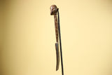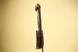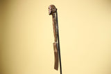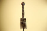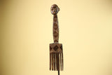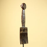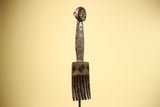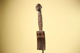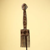 This African carved wood statue comb features geometric patterns and a sculpted head detail. The statue piece measures 35.2 cm × 7.6 cm × 4 cm (13.8" × 3" × 1.5"). A vintage statue with natural wear that adds character. Hand-carved with bold tribal design, it represents traditional West African artistry. Ideal as a statue display piece for collectors or décor. Stand not included.