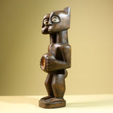 African double-headed figure carved from wood, 43 × 17.5 × 10 cm. The statue shows two heads with a shared body, holding a ritual bowl at the center. This powerful piece symbolizes unity and duality in West African tradition. Hand-carved with natural patina, it is a unique example of tribal artistry, ideal for collectors or striking home display. Good vintage condition with natural age wear.