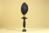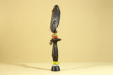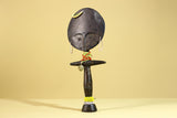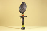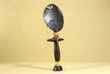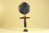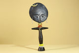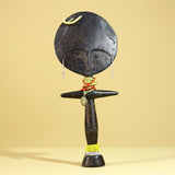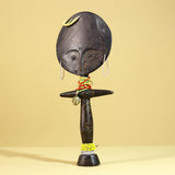 This African fertility figure is a hand-carved wooden sculpture created in a traditional tribal style. The figure features a stylized human form with a rounded disc-shaped head and applied bead adornments, emphasizing symbolic balance and presence.