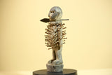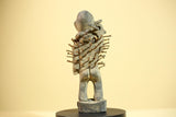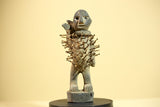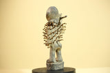 This African nail fetish statue, known as a Nkisi Nkondi, originates from the Kongo people of Congo. Hand-carved from wood and embedded with iron nails, the statue measures 22 cm × 10 cm × 6.5 cm (8.6 × 3.9 × 2.5 in). It served as a spiritual protector—each nail driven to invoke justice or healing. The figure’s strong posture and aged surface reveal powerful ritual symbolism. A captivating tribal art statue for collectors or décor. Stand not included.