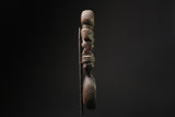 Sculpted spoon whose handle forms an ancestor figure. The subject adopts a rectilinear posture, fingers joined on the abdomen. The head takes up the features of the lipiko mask, the lips are stretched by the labret. The top is hollowed out. Shiny patina with burgundy reflections. Very slight desication cracks, erosions. The Makonde of northern Mozambique and southern Tanzania wore helmet masks called lipiko during initiation ceremonies for young people. The Makonde venerate an ancestor, which explains the abundance of naturalistic female statuary. Besides the African face masks worn during mapiko dances and ngoma ceremonies that educate young people about the demands of marriage and life family, the Makonde also produce body masks featuring the female bust. Young Makonde boys and girls must submit to a period of seclusion of about six months, during which they are taught songs, dances and practical activities. The rules of behaviorin adulthood, sexual life and the obligations of marriage are discussed. Source: "Africa, the Art of a continent" ed. Preste