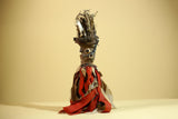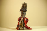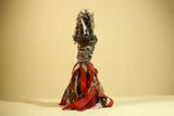 This vintage African statue is an expressive ritual figure created with traditional materials, featuring a hand-carved wooden core wrapped in cloth strips, natural fibers, and feathers. The statue carries the distinct look of a tribal fetish object, used historically in spiritual or protective contexts. Aged textiles, hand-tied bindings, and applied elements like shells and metal pieces enhance the authentic character of the statue, revealing long use and cultural handling.