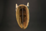This African bird beak mask is hand-carved from wood and adorned with horns and bold painted colors. The mask features striking red and yellow eyes with a long curved beak, symbolizing tribal artistry and cultural identity. Measuring 34 cm × 19 cm (13.4 in × 7.5 in), it makes a unique addition to home decor or art collections. Stand not included.