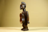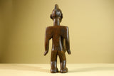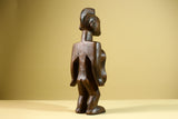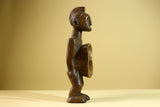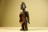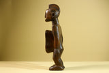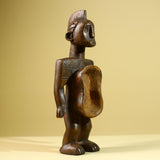 This African container figure is a hand-carved wooden Baule style piece from West Africa. The figure is shaped with traditional tribal features and includes a carved hollow container at the center, used historically for symbolic or practical storage. Crafted from solid wood, it displays detailed carving and natural patina that emphasizes its authenticity. The tribal container makes a unique addition to African art collections, wall displays, or cultural home décor.