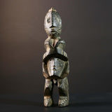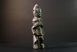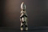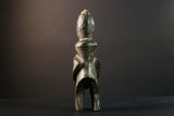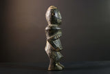 African tribal figure carved from wood with a dark textured surface and stylized tribal details. The statue measures 33 cm (13") high, 9 cm (3.5") wide, and 8.5 cm (3.3") deep. Featuring a vertical ridge down the face, scarification patterns, and primitive carving style, this figure is an authentic piece of West African art. A distinctive addition for collectors, cultural displays, or home décor.