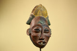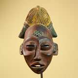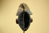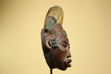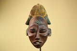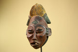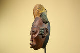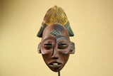 This African Baule mask is a hand-carved wood piece from Côte d’Ivoire, featuring classic tribal styling and an elaborate coiffure. The mask shows carved scarification, narrow eyes, and painted coloration with age-worn patina. Measuring 28 cm x 16 cm x 9 cm (11" x 6.3" x 3.5"), this vintage mask displays wear consistent with age and use. A striking example of West African artistry, ideal for wall display, décor, or collection. Stand not included.