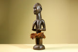 Statue – This African tribal statue is a finely hand-carved wooden figure featuring bold geometric details and a natural raffia skirt. The sculpture portrays a stylized female figure with an elongated neck, pronounced facial features, and detailed chest carving. Crafted in traditional style, this authentic piece represents cultural artistry and symbolism, making it a distinctive collectible for display.