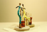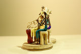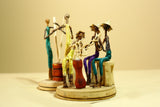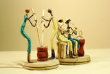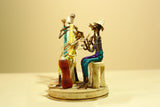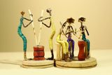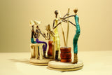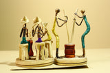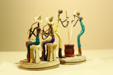 This African tribal statue features handmade wire-wrapped figures arranged on a carved wood base, creating a lively artisan statue scene. Height is 14.5 cm (5.7"), width 11.8 cm (4.6"), depth 11.5 cm (4.5"). The statue shows vintage wear consistent with age. Bright fibers, wood seating, and woven details highlight its cultural style. A unique African statue for display, décor, or collection.