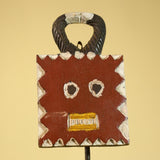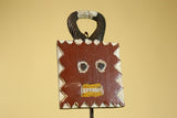 This hand-carved African wooden mask lock figure is a striking example of traditional tribal folk art. Featuring a bold square face, carved geometric borders, and painted facial details, this piece reflects the symbolic and protective role such objects held in African architecture and ritual settings.