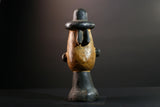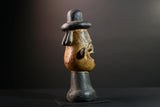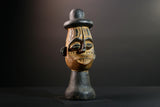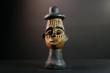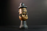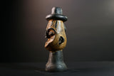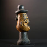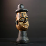 This African head sculpture is a striking ceremonial piece from the Songye tribe of Congo, featuring bold lines and spiritual expression. Expertly hand-carved from dense hardwood, the figure displays a tall domed hat, intricate facial details, and symmetrical form—hallmarks of classic Songye artistry.