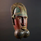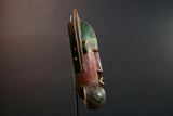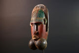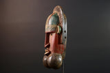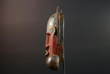 African mask Songye tribal decor with carved geometric features, red angular face, and bold cheek shapes wall hanging sculpture G5572