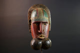 This striking African mask features an angular red face, projecting cheeks, and a carved African mask grid-patterned forehead. The design reflects the traditional style of the Songye African mask tribe, known for their spiritual symbolism and sculptural power. Bold black rounded cheek forms dominate the lower portion, adding dramatic contrast. The mask is finished with subtle green and earth-tone pigments, enhancing its tribal appearance.