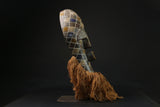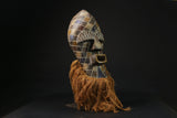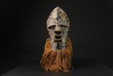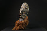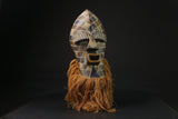The most popular masks created by the Songye people are worn in connection with the Kifwebe secret society. They are called Kifwebe, meaning "mask" in the Songye language. The Kifwebe society used their masks to ward off any threat or disaster. By means of supernatural force, the mask has the capacity to heal. It is attached with a woven costume and beard of raffia bast, and danced at different ceremonies. Each mask, colors and costumes all have symbolic meaning. The male dancers who wear the male mask dance aggressively; with the aim of encouraging social conformity. on the other hand, the dancer who wears the female mask display more gentle and controlled movements and is assumed