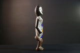 Songye power figure carved in wood with painted diamond motifs, originating from the Democratic Republic of Congo. This tribal statue measures 39.2 × 7 × 7 cm (15.4 × 2.7 × 2.7 in). Songye figures embody ancestral power and ritual protection, reflecting tribal spirituality. The elongated form, painted surface, and scarification details highlight Songye artistry. A rare cultural piece of African art, ideal for display, home decor, or ethnographic collections.