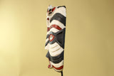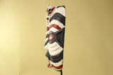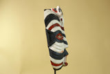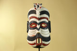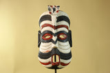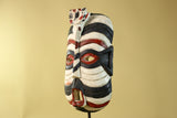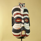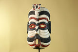 This African Kifwebe style mask is a visually powerful hand-carved wooden mask featuring bold black, white, and red painted patterns. Its tall vertical shape, pierced eyes, and open mouth reflect mask designs traditionally used in Kifwebe cultural performances and ceremonies across parts of Congo