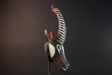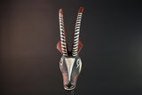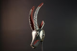 This African mask depicts a stylized antelope head with bold geometric mask lines, a tall curved striped horn mask , and strong color contrast in black, red, and white. The African mask is carved from wood and painted with tribal patterns, with cutout ears and an angular, elongated snout that emphasize the antelope’s dynamic profile.