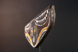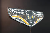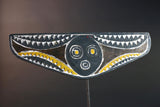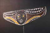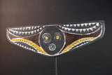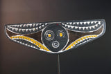This handcrafted mask features a bold circular face with concentric eyes and mouth, symbolizing clarity and vision. The outstretched wings of the mask are covered in dramatic zigzag and triangular motifs painted in white, yellow, and black. These shapes refer to water, lightning, and the rhythm of spiritual cycles. The symmetry and raw textures give this mask a commanding presence—both in performance and display.