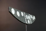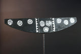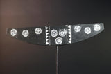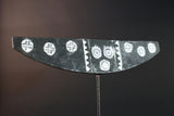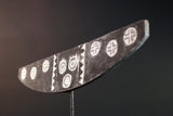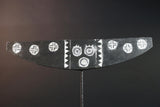 The mask’s long, horizontal shape is decorated in sharp white symbols against a dark wood surface. Its central zone features a triple eye and sunburst configuration—classic spiritual signs representing clarity, insight, and vision. Radiating from the center are cross-circle motifs that echo the Bwa understanding of life cycles and unity. All of this is enclosed in jagged zigzag bands symbolizing cosmic energy.