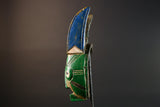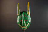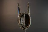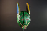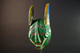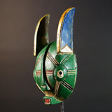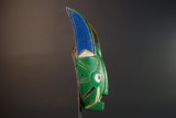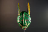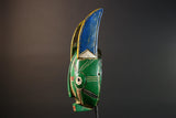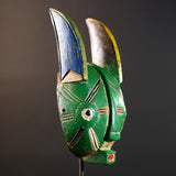 Discover the authentic Bwa mask tribal art piece, hand-carved in Burkina Faso. This Bwa mask is painted in vibrant green, blue, yellow, and natural earth tones. The Bwa mask features cowrie-shell-trimmed fabric headdress and a raffia beard, reflecting traditional Bwa design. Perfect as wall decor or a gallery accent, this Bwa mask brings rich cultural history into any home or office. Display solo or alongside other African masks. Handmade Bwa mask offers primitive charm and storytelling in contemporary interiors.