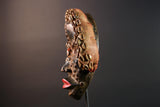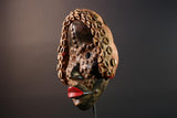 This African tribal mask features a hand-carved hardwood face mask adorned with raised forehead nodules, a bold vertical nose ridge, and bright red lips. Its cowrie shell headdress is mounted on a cotton cloth backing for authentic Liberian ceremonial use. Perfect for adding cultural richness to any space. Stand not included in the deal