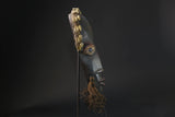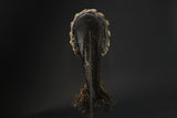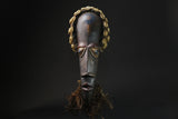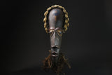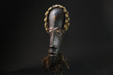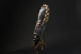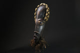 This African Mask from the Dan people of the Coast and Liberia is . It features cowrie shells, bells, fabric and raffia, stitched to a hand-painted wooden mask. Cowrie shells were once used as money by many African peoples, so their abundance on this mask is a symbol of wealth. A variation of côte d'Ivoire's Dangle African wood African face africa wood mask,, this sculpted face features a sunken look enhanced by a sculpted wolf coated in kaolin. The mouth is classically protruding. A grainy aggregate remains at the top of a metal hook on either side. A beard extended the chin. Smooth patina slightly satiny. Dan wood African face africa wood mask,, of varied design, usually perform at very theatrical entertainment parties where women play a leading role. The wood African face Africa wood mask ,called "mouser" called Deanglé defines an ideal of beauty and benevolence because it is carved in honor of young girls of the village or famous men. Also used in circumcision rites
