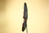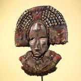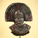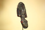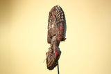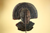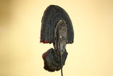 This vintage Dan mask presents powerful traditional form with deep patina, cowrie shell decoration, and aged red textile panels. The mask features carved wood, wrapped cloth, and a worn ceremonial collar that highlights its authentic character. Created for cultural use in the Liberia region, the mask offers striking presence for collectors of African art. A bold tribal mask that stands out beautifully in any display Stand not included.